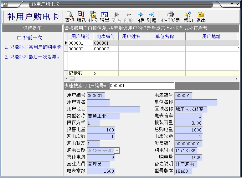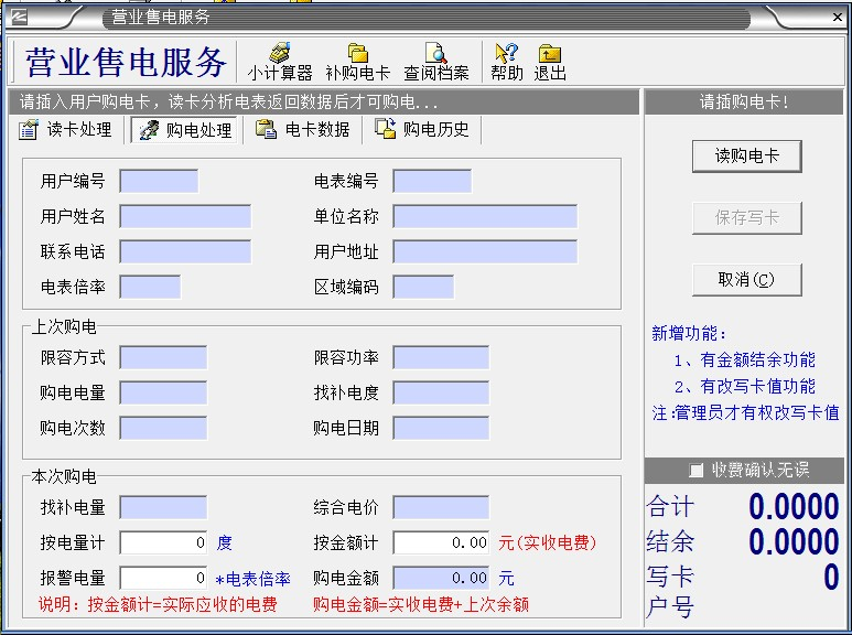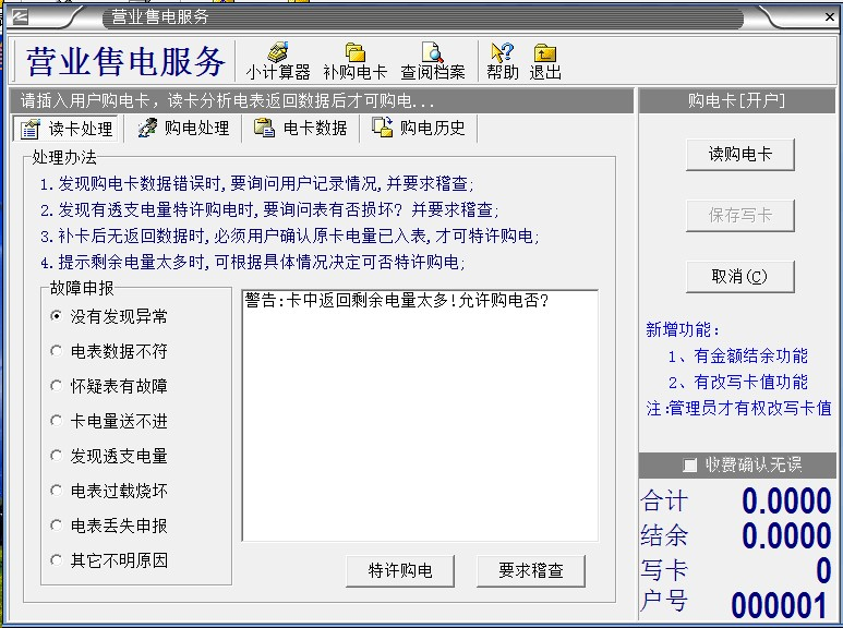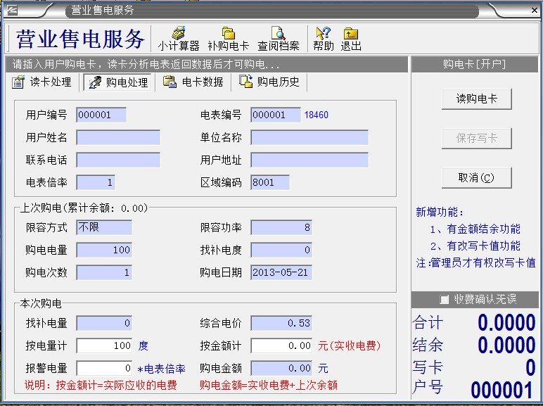 3、電表第一次使用,電表里有20度預(yù)置電量,是不能用完,要馬上給用戶開戶,插IC卡使用,第二次是沒關(guān)系的,用完了再?zèng)_也是可以的。
